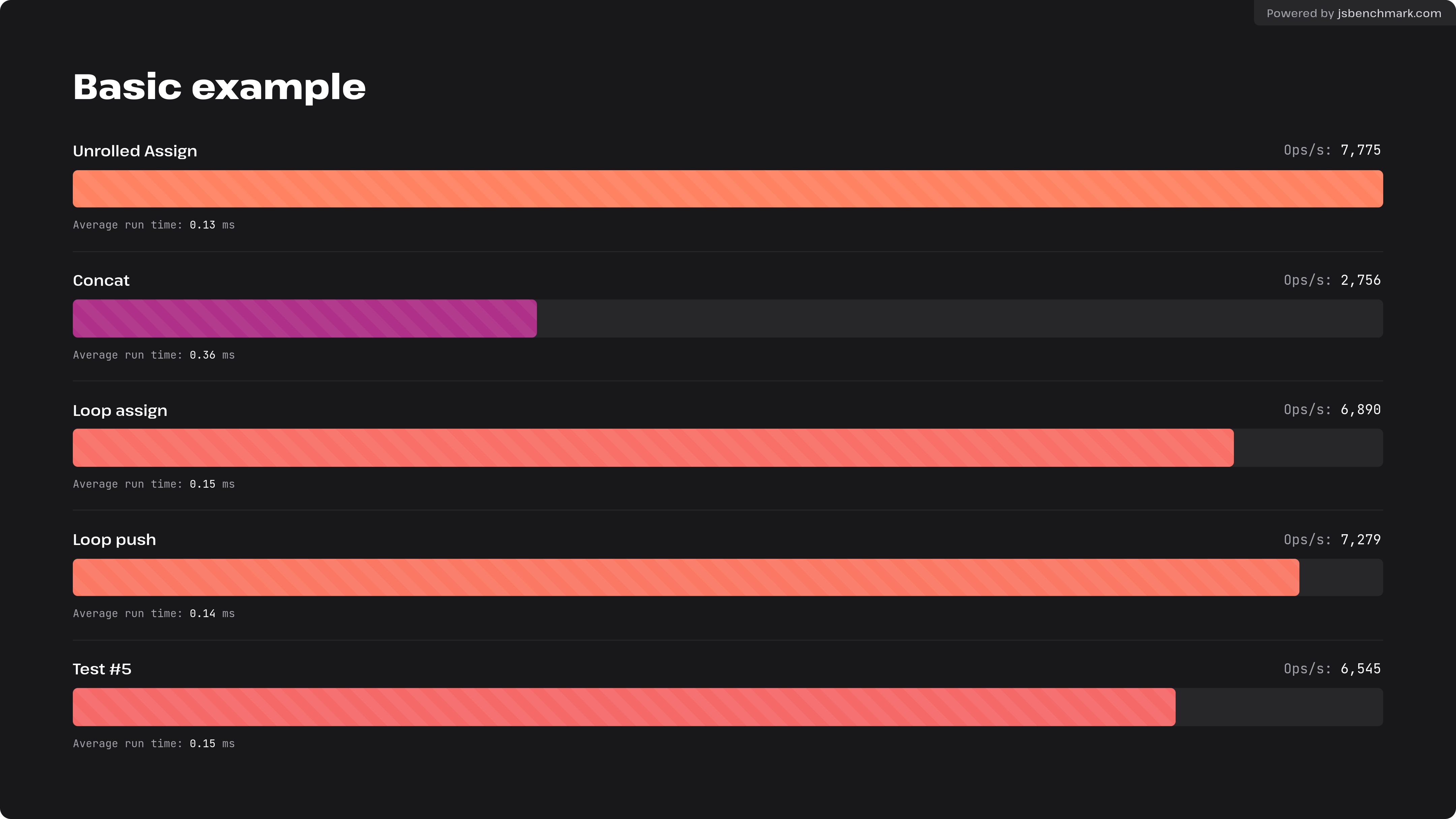 https://jsbenchmark.com/#eyJjYXNlcyI6W3siaWQiOiJEMFFRNVVQaUhDdGtWTjBKVzlmVXgiLCJjb2RlIjoidmFyIGEgPSBEQVRBLmEuc2xpY2UoKVxudmFyIGIgPSBEQVRBLmJcbmZvciAobGV0IGwgPSAwOyBsIDwgREFUQS5hcHBlbmRzOyBsKyspIHtcbmNvbnN0IGFsID0gYS5sZW5ndGg7XG52YXIgaSA9IGIubGVuZ3RoO1xuYS5sZW5ndGggPSBhbCArIGk7XG52YXIgaiA9IGFsICsgaTtcbnZhciByID0gaSAmIDYzO1xud2hpbGUgKHItLSkgYVstLWpdID0gYlstLWldO1xud2hpbGUgKGkpIHtcbmkgLT0gNjQ7IGogLT0gNjQ7XG5jb25zdCB4MD1iW2ldLHgxPWJbaSsxXSx4Mj1iW2krMl0seDM9YltpKzNdLHg0PWJbaSs0XSx4NT1iW2krNV0seDY9YltpKzZdLHg3PWJbaSs3XSx4OD1iW2krOF0seDk9YltpKzldLHgxMD1iW2krMTBdLHgxMT1iW2krMTFdLHgxMj1iW2krMTJdLHgxMz1iW2krMTNdLHgxND1iW2krMTRdLHgxNT1iW2krMTVdLHgxNj1iW2krMTZdLHgxNz1iW2krMTddLHgxOD1iW2krMThdLHgxOT1iW2krMTldLHgyMD1iW2krMjBdLHgyMT1iW2krMjFdLHgyMj1iW2krMjJdLHgyMz1iW2krMjNdLHgyND1iW2krMjRdLHgyNT1iW2krMjVdLHgyNj1iW2krMjZdLHgyNz1iW2krMjddLHgyOD1iW2krMjhdLHgyOT1iW2krMjldLHgzMD1iW2krMzBdLHgzMT1iW2krMzFdLHgzMj1iW2krMzJdLHgzMz1iW2krMzNdLHgzND1iW2krMzRdLHgzNT1iW2krMzVdLHgzNj1iW2krMzZdLHgzNz1iW2krMzddLHgzOD1iW2krMzhdLHgzOT1iW2krMzldLHg0MD1iW2krNDBdLHg0MT1iW2krNDFdLHg0Mj1iW2krNDJdLHg0Mz1iW2krNDNdLHg0ND1iW2krNDRdLHg0NT1iW2krNDVdLHg0Nj1iW2krNDZdLHg0Nz1iW2krNDddLHg0OD1iW2krNDhdLHg0OT1iW2krNDldLHg1MD1iW2krNTBdLHg1MT1iW2krNTFdLHg1Mj1iW2krNTJdLHg1Mz1iW2krNTNdLHg1ND1iW2krNTRdLHg1NT1iW2krNTVdLHg1Nj1iW2krNTZdLHg1Nz1iW2krNTddLHg1OD1iW2krNThdLHg1OT1iW2krNTldLHg2MD1iW2krNjBdLHg2MT1iW2krNjFdLHg2Mj1iW2krNjJdLHg2Mz1iW2krNjNdO1xuYVtqXT14MDsgYVtqKzFdPXgxOyBhW2orMl09eDI7IGFbaiszXT14MzsgYVtqKzRdPXg0OyBhW2orNV09eDU7IGFbais2XT14NjsgYVtqKzddPXg3O1xuYVtqKzhdPXg4OyBhW2orOV09eDk7IGFbaisxMF09eDEwOyBhW2orMTFdPXgxMTsgYVtqKzEyXT14MTI7IGFbaisxM109eDEzOyBhW2orMTRdPXgxNDsgYVtqKzE1XT14MTU7XG5hW2orMTZdPXgxNjsgYVtqKzE3XT14MTc7IGFbaisxOF09eDE4OyBhW2orMTldPXgxOTsgYVtqKzIwXT14MjA7IGFbaisyMV09eDIxOyBhW2orMjJdPXgyMjsgYVtqKzIzXT14MjM7XG5hW2orMjRdPXgyNDsgYVtqKzI1XT14MjU7IGFbaisyNl09eDI2OyBhW2orMjddPXgyNzsgYVtqKzI4XT14Mjg7IGFbaisyOV09eDI5OyBhW2orMzBdPXgzMDsgYVtqKzMxXT14MzE7XG5hW2orMzJdPXgzMjsgYVtqKzMzXT14MzM7IGFbaiszNF09eDM0OyBhW2orMzVdPXgzNTsgYVtqKzM2XT14MzY7IGFbaiszN109eDM3OyBhW2orMzhdPXgzODsgYVtqKzM5XT14Mzk7XG5hW2orNDBdPXg0MDsgYVtqKzQxXT14NDE7IGFbais0Ml09eDQyOyBhW2orNDNdPXg0MzsgYVtqKzQ0XT14NDQ7IGFbais0NV09eDQ1OyBhW2orNDZdPXg0NjsgYVtqKzQ3XT14NDc7XG5hW2orNDhdPXg0ODsgYVtqKzQ5XT14NDk7IGFbais1MF09eDUwOyBhW2orNTFdPXg1MTsgYVtqKzUyXT14NTI7IGFbais1M109eDUzOyBhW2orNTRdPXg1NDsgYVtqKzU1XT14NTU7XG5hW2orNTZdPXg1NjsgYVtqKzU3XT14NTc7IGFbais1OF09eDU4OyBhW2orNTldPXg1OTsgYVtqKzYwXT14NjA7IGFbais2MV09eDYxOyBhW2orNjJdPXg2MjsgYVtqKzYzXT14NjM7XG59XG59IiwibmFtZSI6IlVucm9sbGVkIEFzc2lnbiIsImFzeW5jIjpudWxsLCJkZXBlbmRlbmNpZXMiOltdfSx7ImlkIjoiX1JCYTRxTER0SmxTZlBjODFIMC1PIiwiY29kZSI6ImxldCBhID0gREFUQS5hLnNsaWNlKCk7XG5mb3IgKGxldCBsID0gMDsgbCA8IERBVEEuYXBwZW5kczsgbCsrKSB7XG5hID0gYS5jb25jYXQoREFUQS5iKX0iLCJuYW1lIjoiQ29uY2F0IiwiYXN5bmMiOm51bGwsImRlcGVuZGVuY2llcyI6W119LHsiaWQiOiJVZkpYOVN2TXlPUWlZYUk3ZTVFTTIiLCJjb2RlIjoiY29uc3QgYSA9IERBVEEuYS5zbGljZSgpO1xuXG5mb3IgKGxldCBsID0gMDsgbCA8IERBVEEuYXBwZW5kczsgbCsrKSB7XG4gIGZvciAobGV0IGkgPSAwOyBpIDwgREFUQS5iLmxlbmd0aDsgaSsrKSB7XG4gIGFbYS5sZW5ndGhdID0gREFUQS5iW2ldO1xufVxufSIsIm5hbWUiOiJMb29wIGFzc2lnbiIsImFzeW5jIjpudWxsLCJkZXBlbmRlbmNpZXMiOltdfSx7ImlkIjoiazlLckJSMFAzWDhpeHdZSmt0Nzl4IiwiY29kZSI6ImNvbnN0IGEgPSBEQVRBLmEuc2xpY2UoKTtcblxuZm9yIChsZXQgbCA9IDA7IGwgPCBEQVRBLmFwcGVuZHM7IGwrKykge1xuICBmb3IgKGNvbnN0IHggb2YgREFUQS5iKSBhLnB1c2goeCk7XG59IiwibmFtZSI6Ikxvb3AgcHVzaCIsImFzeW5jIjpudWxsLCJkZXBlbmRlbmNpZXMiOltdfSx7ImlkIjoiQnVwR0xYdGdGcU5qZVp6TU5rZF9mIiwiY29kZSI6ImxldCBhID0gREFUQS5hLnNsaWNlKCk7XG5cbmZvciAobGV0IGwgPSAwOyBsIDwgREFUQS5hcHBlbmRzOyBsKyspIHtcbiAgYS5wdXNoLmFwcGx5KGEsIERBVEEuYilcbn0iLCJkZXBlbmRlbmNpZXMiOltdfV0sImNvbmZpZyI6eyJuYW1lIjoiQmFzaWMgZXhhbXBsZSIsInBhcmFsbGVsIjpmYWxzZSwiZ2xvYmFsVGVzdENvbmZpZyI6eyJkZXBlbmRlbmNpZXMiOltdfSwiZGF0YUNvZGUiOiJyZXR1cm4ge2E6IFsuLi5BcnJheSgyMzA1Mykua2V5cygpXSwgYjogWy4uLkFycmF5KDIwMTIpLmtleXMoKV0sIGFwcGVuZHM6IDEwfTsifX0
