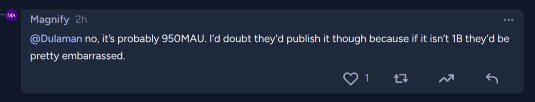 More of a fun fact than an argument for resolution: Duolingo has 47m DAUs and 130m MAUs. That is a very low correlation, especially for an app that so heavily encourages streaks. I wish they reported weekly active users too.